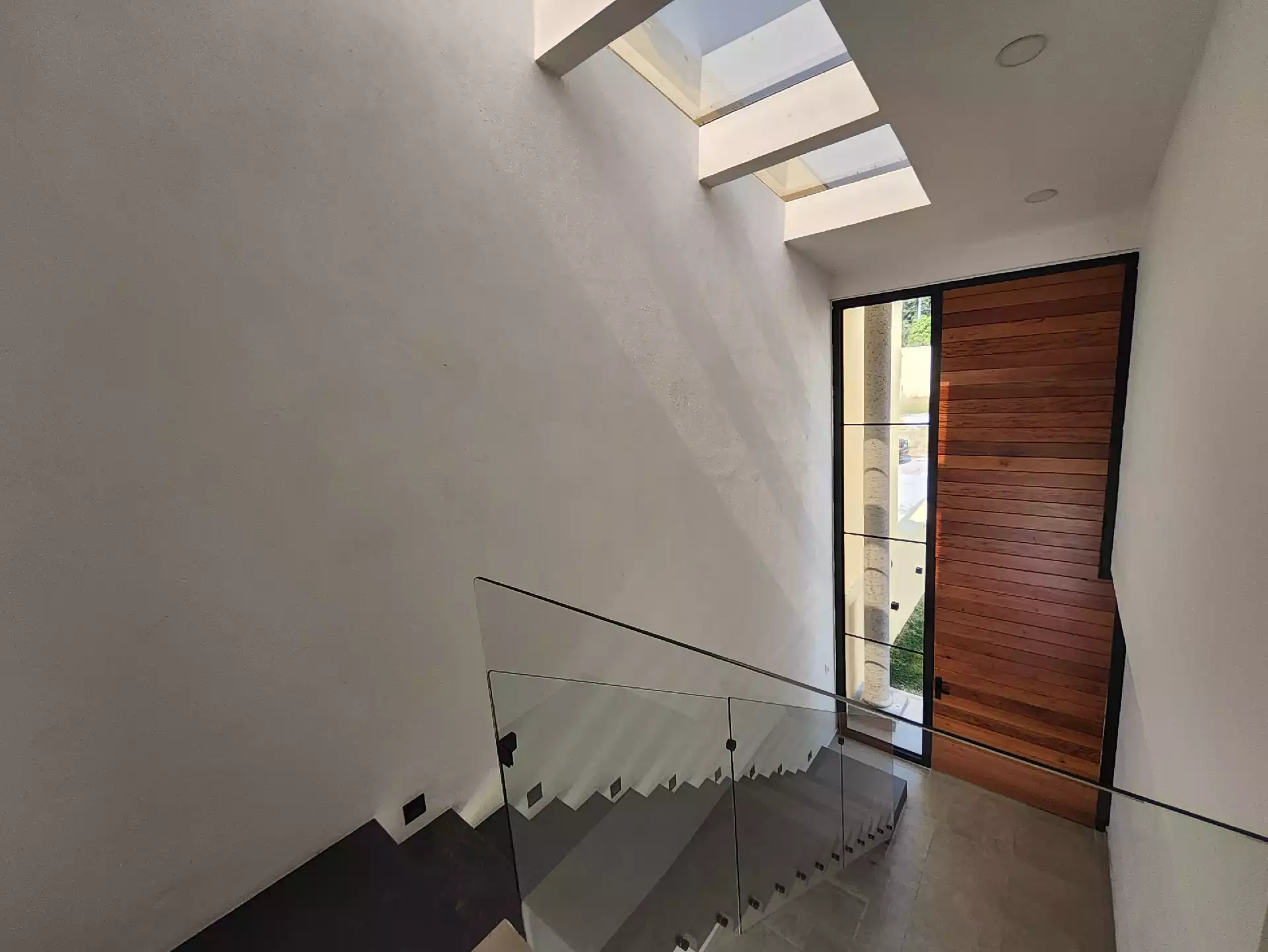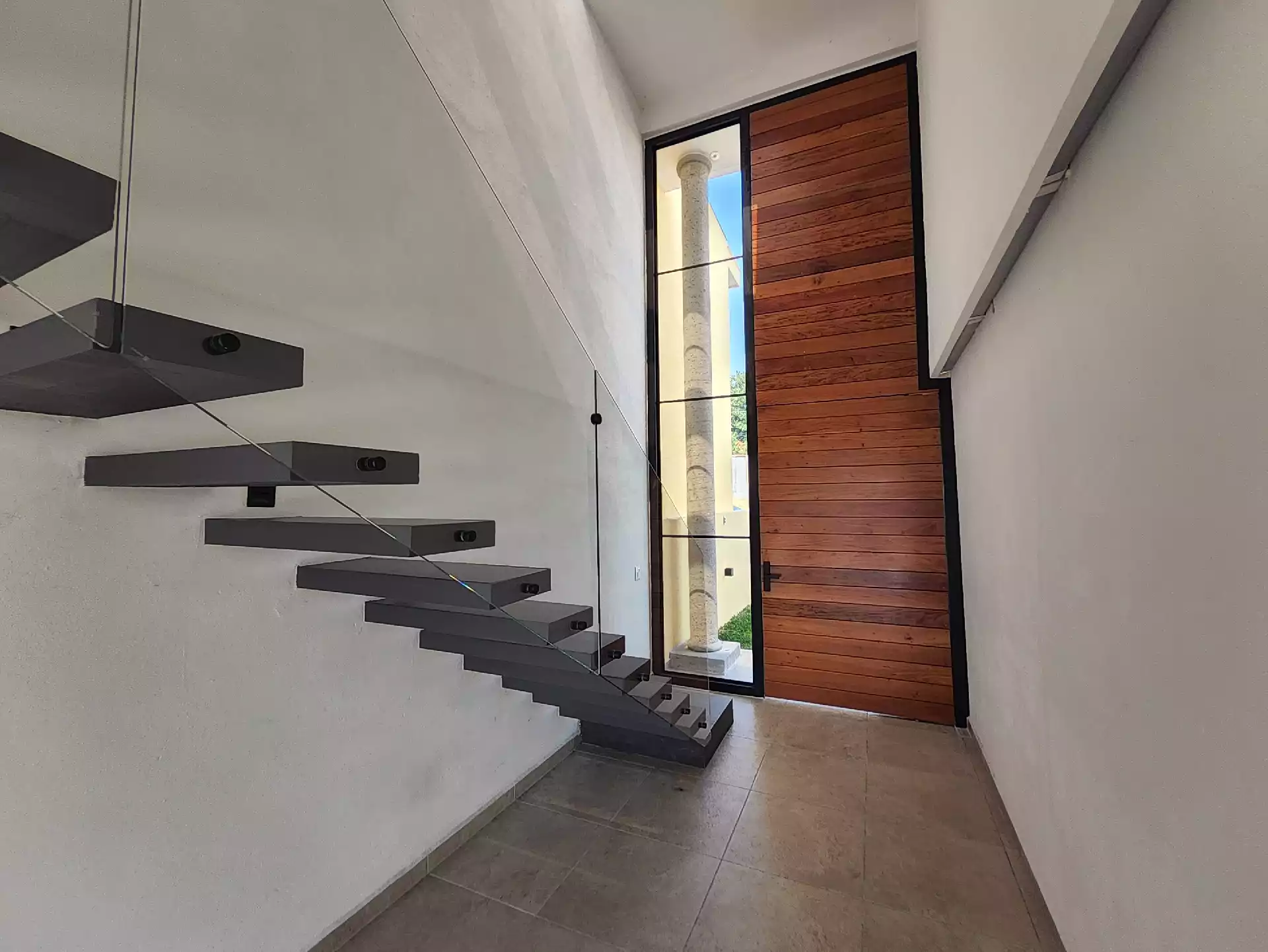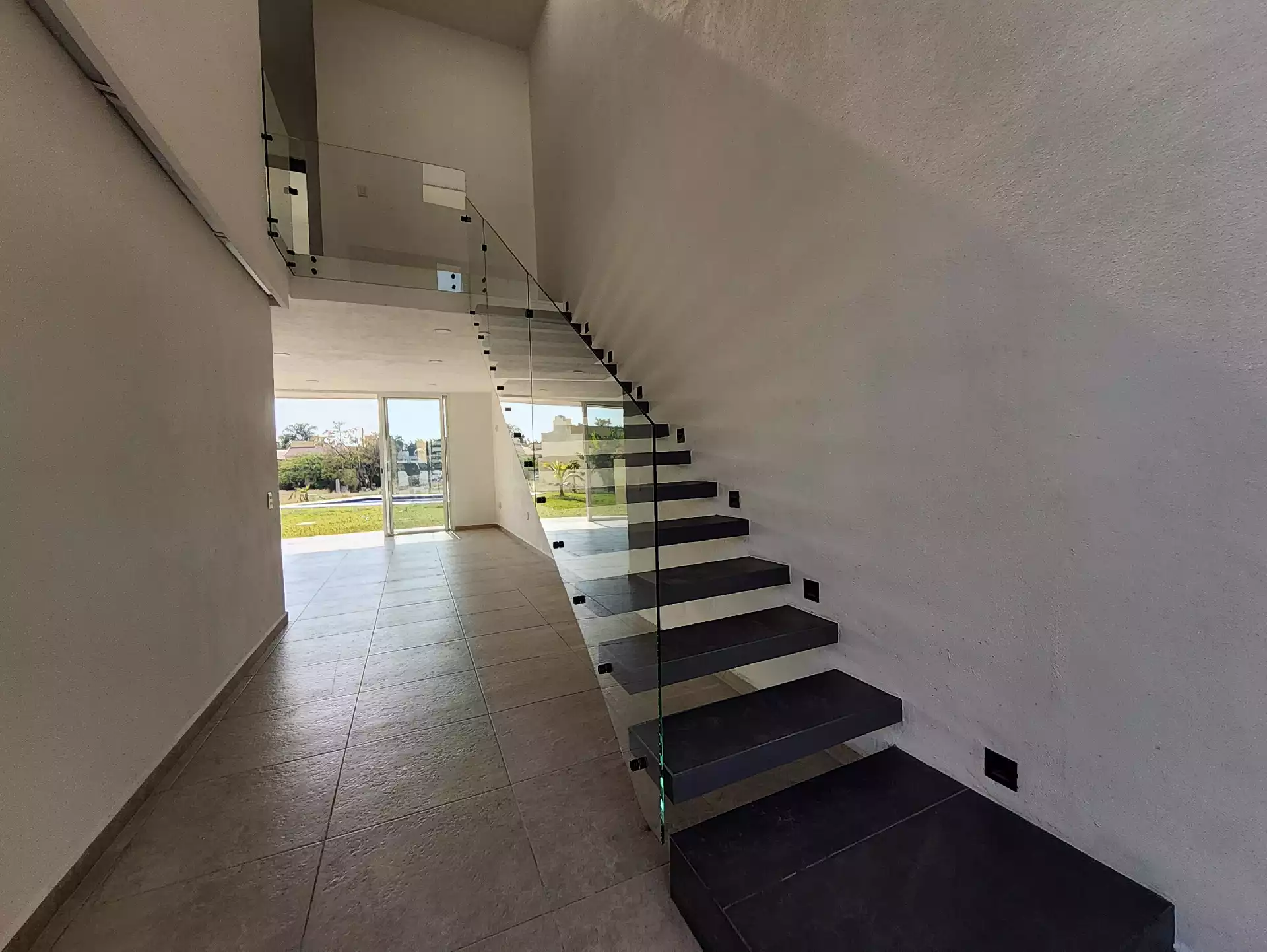 • Acceso principal de doble altura enmarcado con dos columnas iluminadas y terraza al frente. • Recámara numero 1 en PB o estudio, con cancel a terraza ubicada en el frente. • Baño completo para servicio de visitas y recámara de PB.